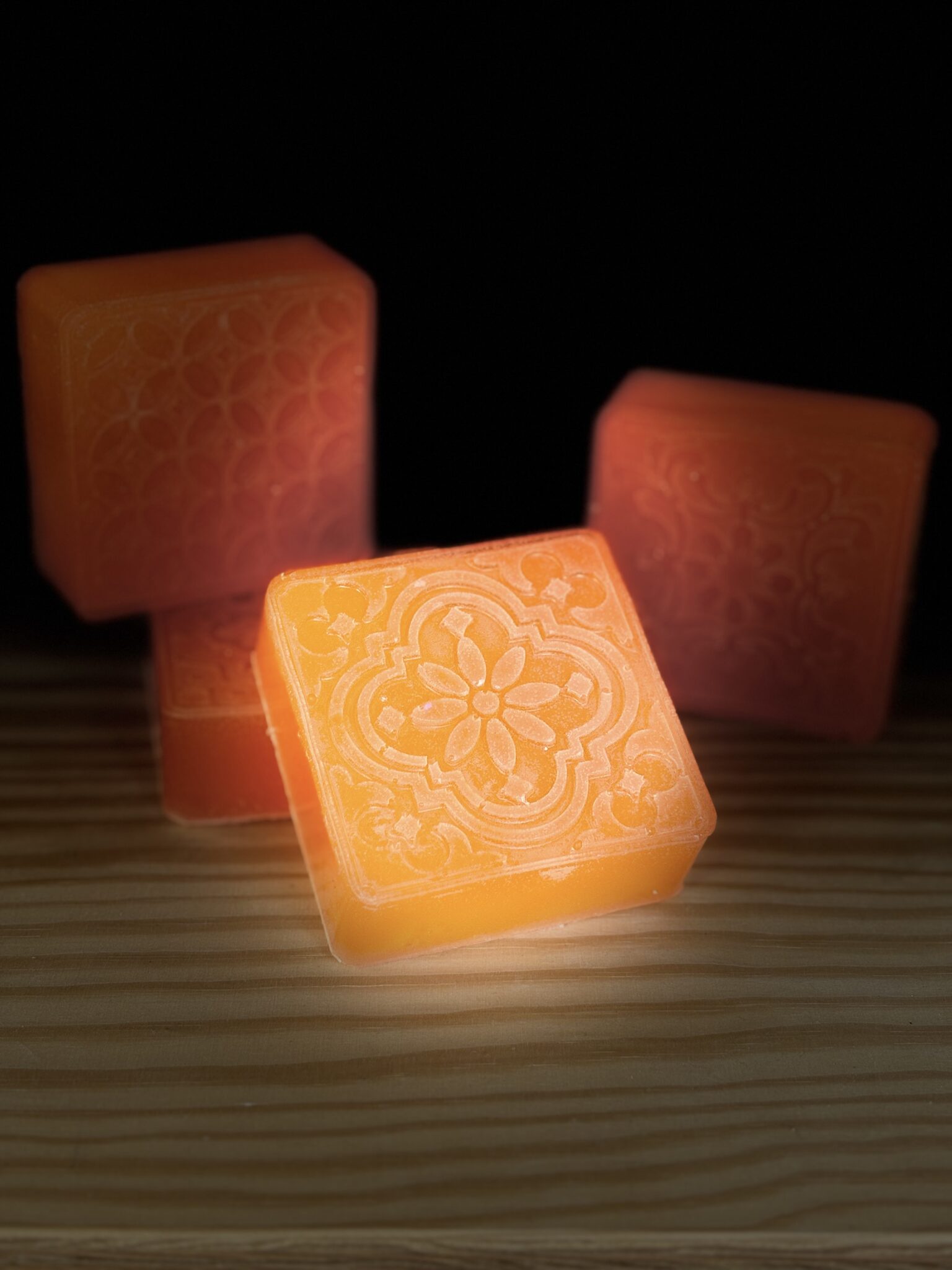 Méret: 7 × 7 × 3 cm | Tömeg: kb. 130 g | Illat: narancs